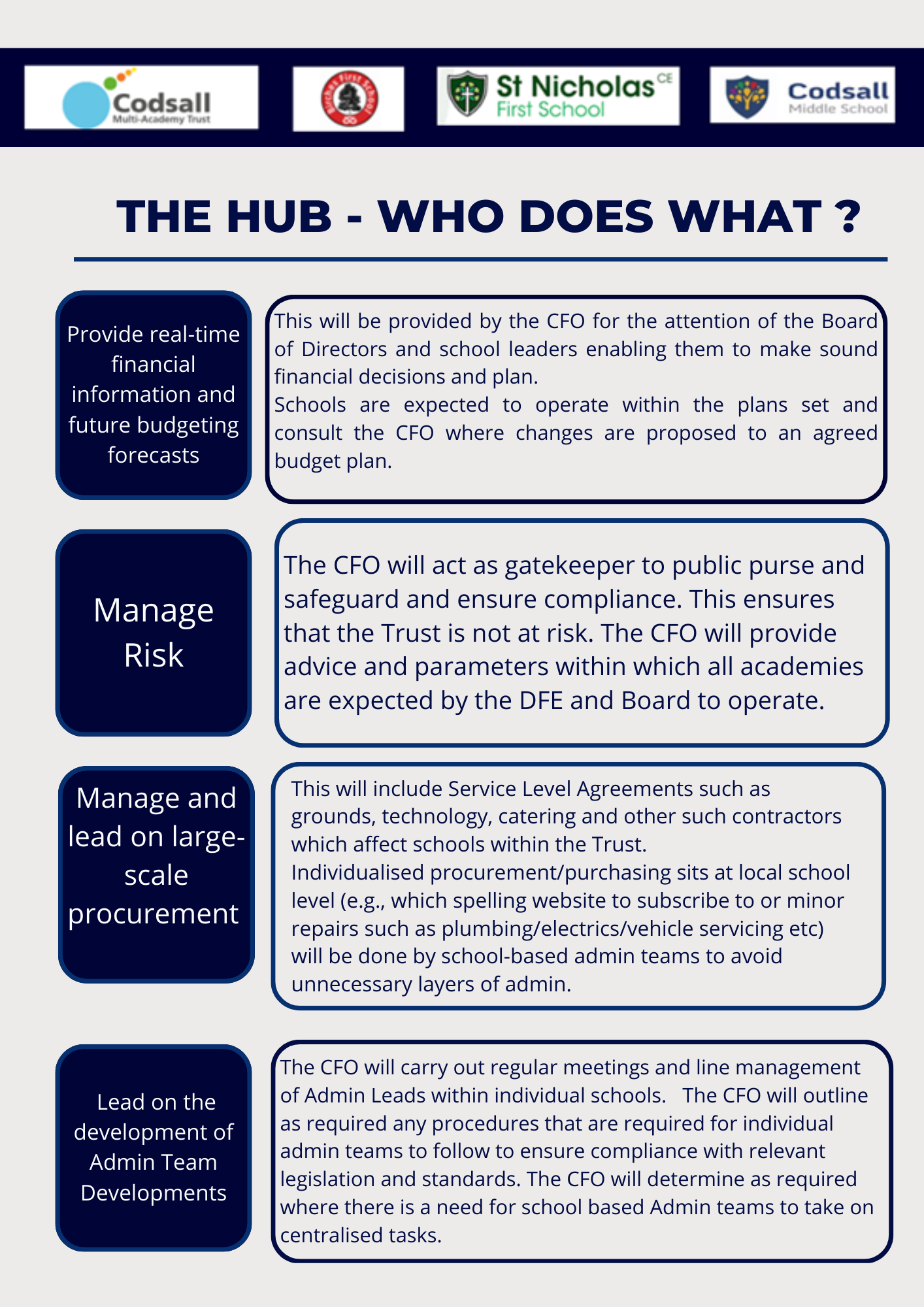 We ensure that we are compliant and efficient through the strong management of business and operations, encompassing safeguarding, finance, human resources, estate management, and governance. This ensures that Head Teachers and School Leaders remain focused on their core business of Education.
